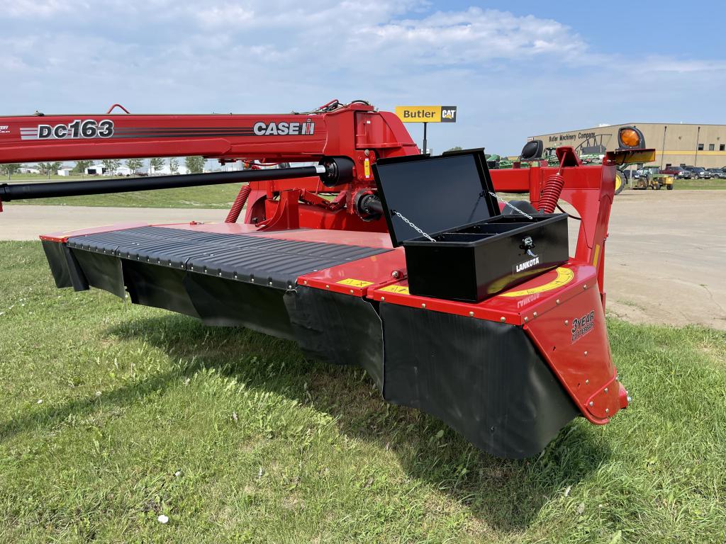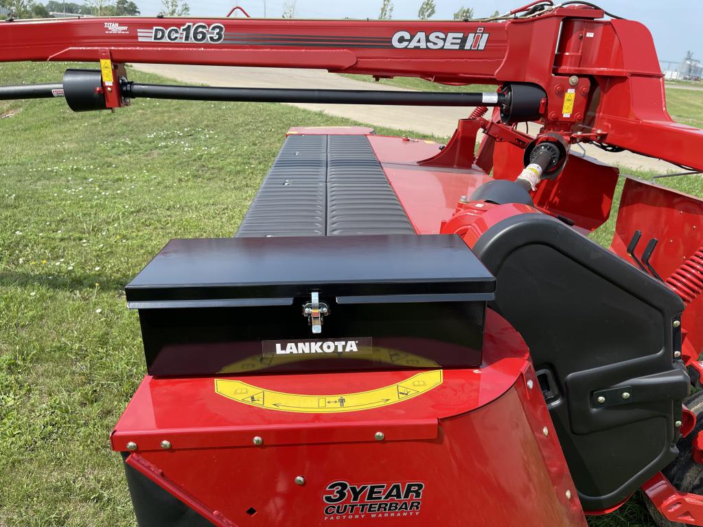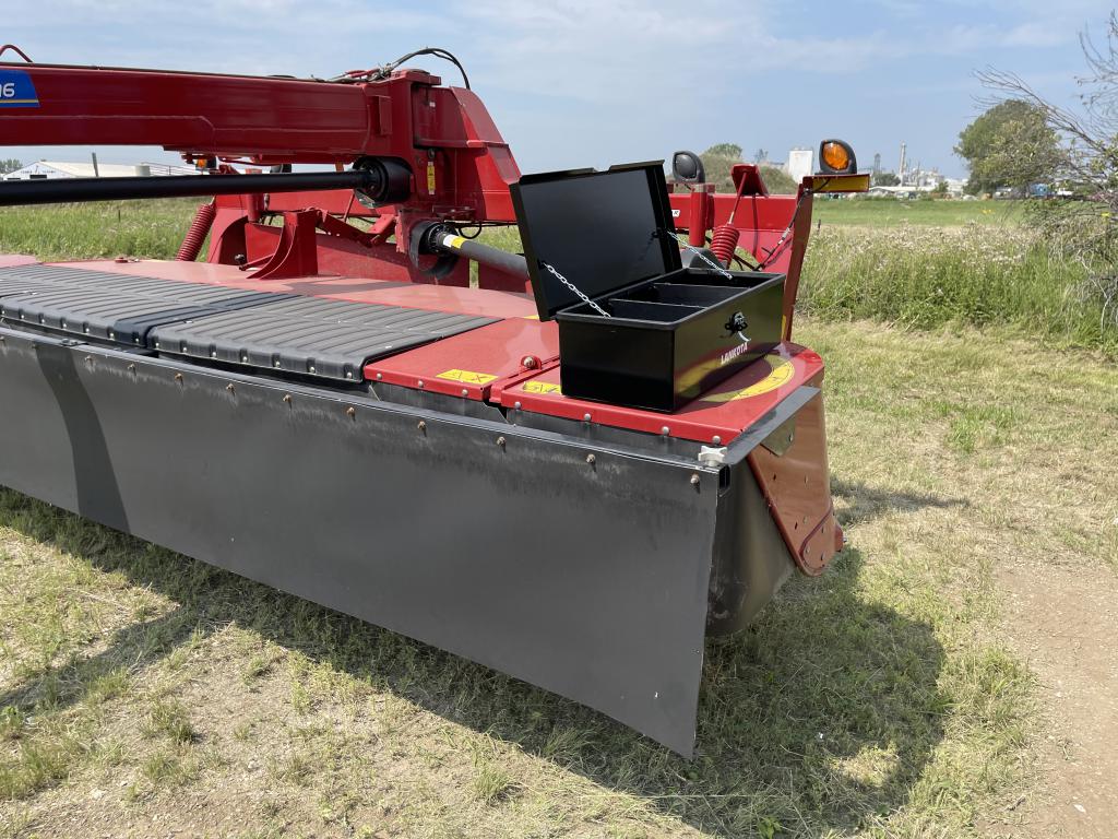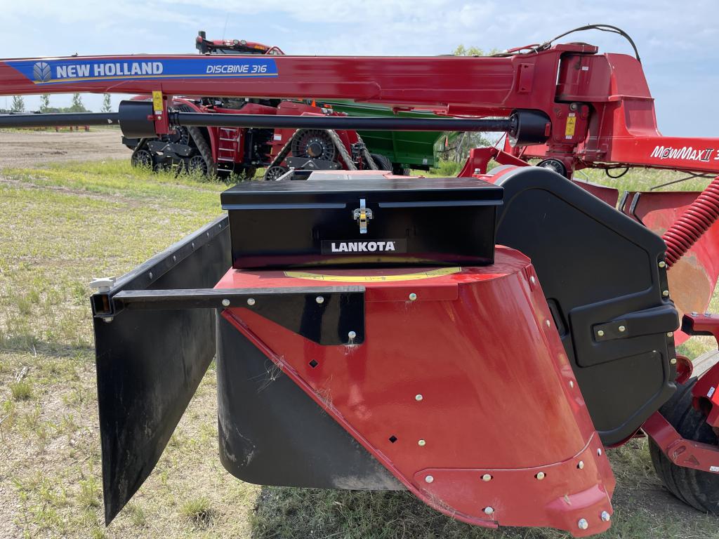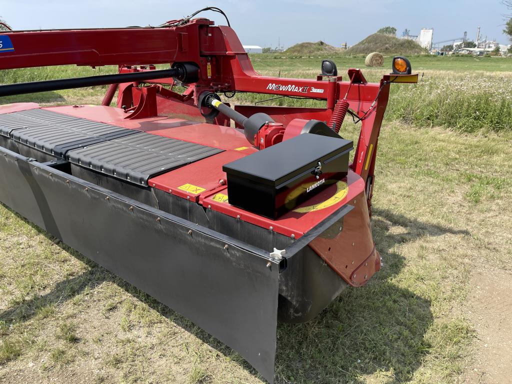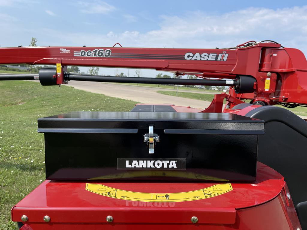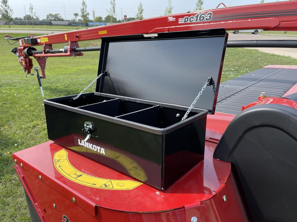 The universal toolbox can mount to any flat surface with minimum dimensions of 22″ wide x 6″ deep, with access to the back and/or bottom side for bolting. Example: NH® Discbine 316 and CIH® DC163.