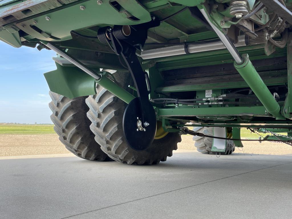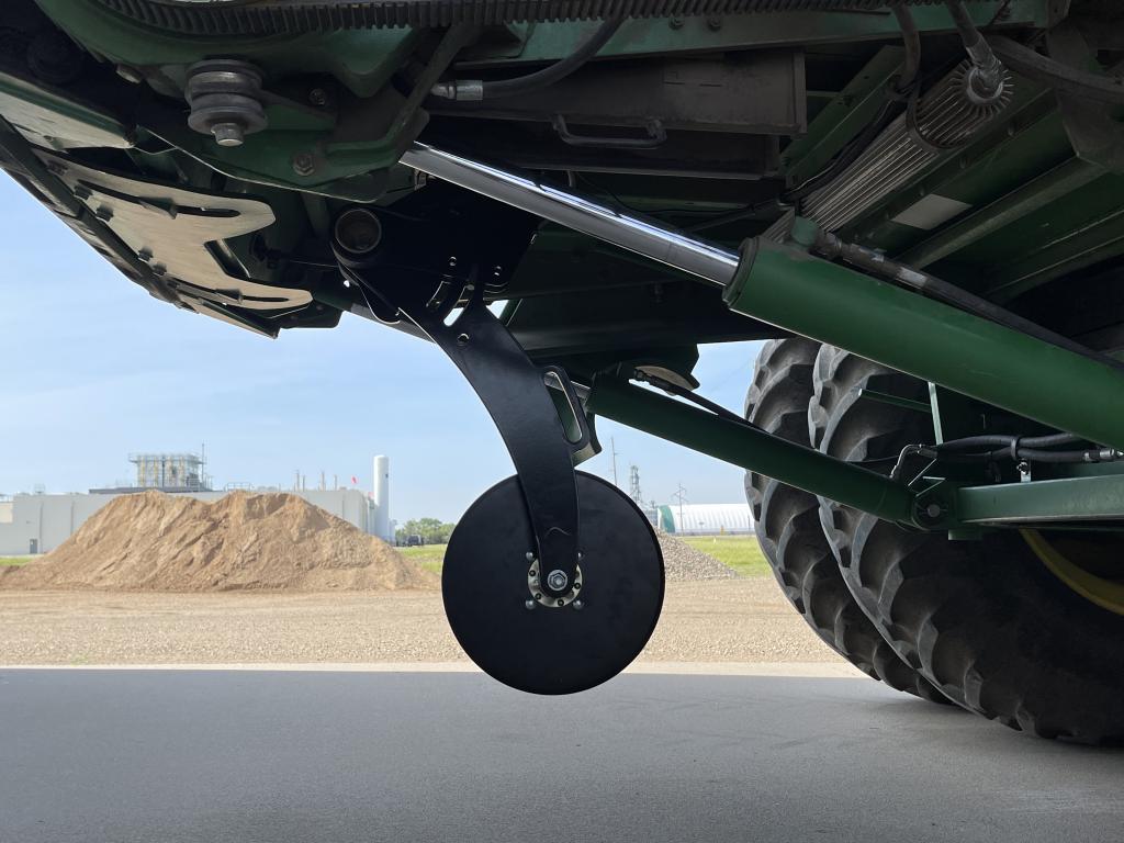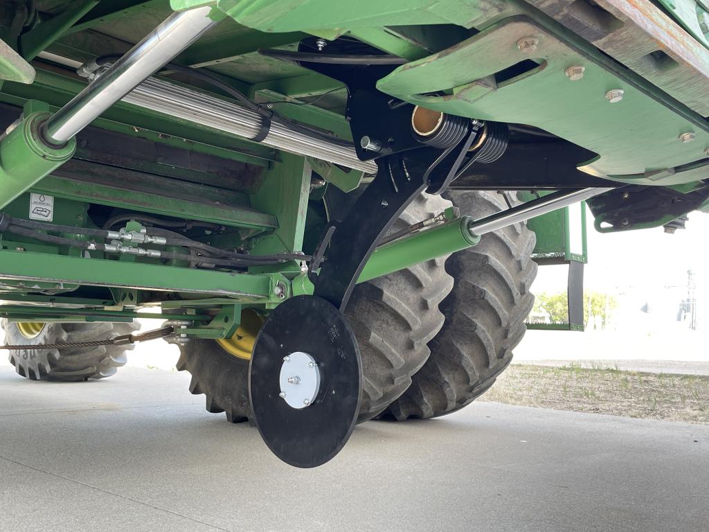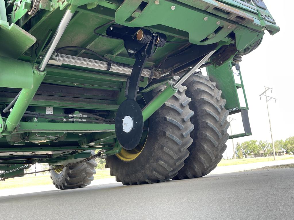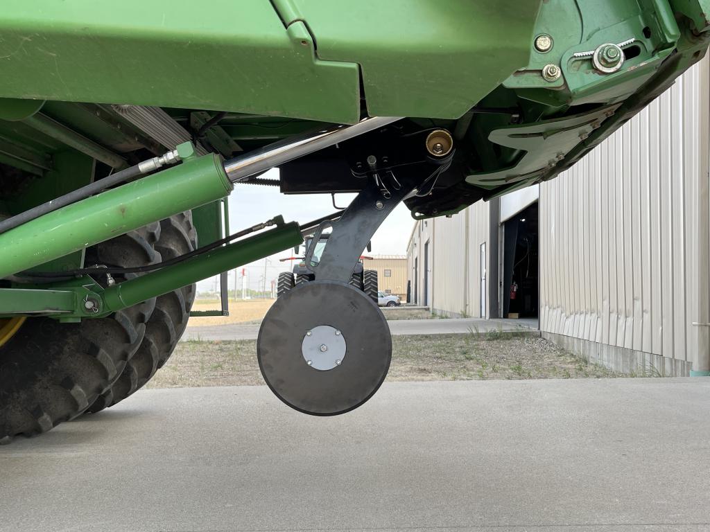 The LANED21379 greatly reduces the static electricity created on combines by grounding the combine through no-till and tilled residue directly into the dirt. The rotating straight blade eliminates static, which minimizes sparks that start fires and electrical charges that can affect on-board electronic systems. The quick-adjust two-position mounting bracket allows for optimal ground penetration while operating the feeder house low for soybean and corn harvest, and also at higher positions when combining sunflowers, milo etc. There is no drilling, cutting or welding required. Fits JD® 60, 70, & S Series combines.